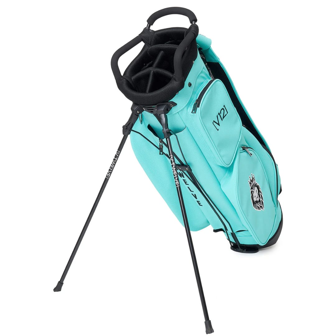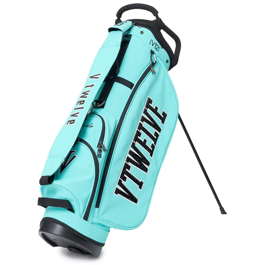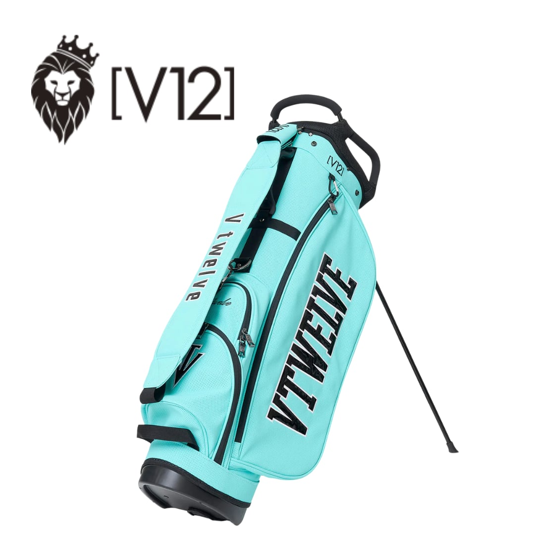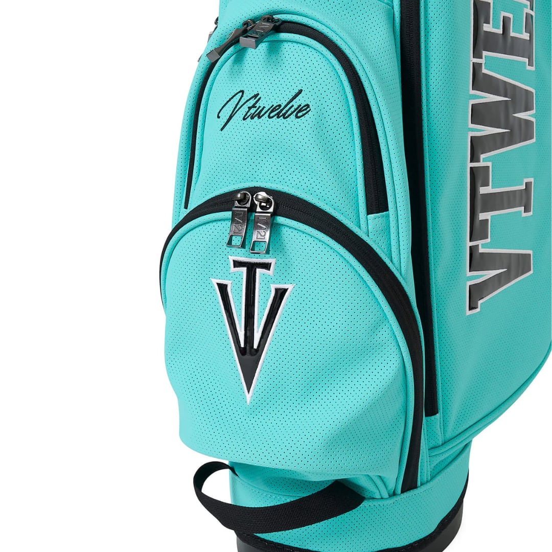 さまざまなV12ロゴをコントラストで表現した9インチのスタンドキャディバッグ。